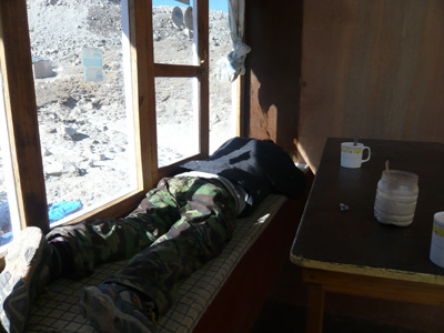 写真(下):カラパタール山頂で高山病になり宿に戻りダウンするシェルパ(←って、キミが倒れちゃ・・・バファリンあげました 笑)