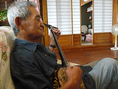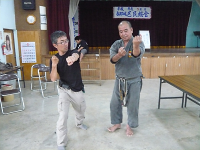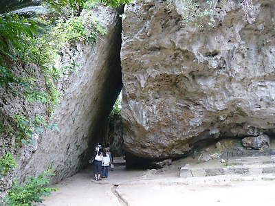 勝連城跡で写真を撮ってもらったオジサン(写真手前)から、「昼飯はウチに来てソバでも食ってけ!」とお誘いをいただく。